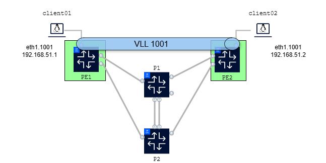 Your customer requested you to add a new VLL service. You may use the existing CA and ANYsec configurations, and you only need to configure the new VLL. Use the JSON files from previous "Get configuration information from the system" task as reference and create the configuration files for both client01 and client02 as well as the gNMIc RPC Set call. Use the following parameters for the new service: